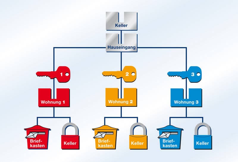 • Wer eine umfangreiche Beratung für eine Schüsselanlage im Eigenheim möchte, der ist bei uns genau richtig. Diese ist meistens für Mehrfamilienhäuser angebracht aber auch für kleinere Häuser oder große Firmen. Man kann durch den Schließplan alles Regeln und somit festlegen wo der Schlüssel passen darf und wo nicht. Bei einer klassischen Zentral-Schliessanlage passt Ihr Wohnungsschlüssel eigentlich immer in Ihrer Wohnungstüre,  in der Haustüre, in Ihrem Kellerraum oder in Gemeinschaftsräumen wie Waschküchen, Garagentoren oder Tiefgaragen Einfahrten. Da bei einer  durch uns gut geplanten Schließanlage meist viele andere Schlüssel wegfallen, haben Sie somit auch einen kleineren Schlüsselbund und dadurch auch eine einfachere Schlüsselverwaltung. Die Beratung durch uns im Unternehmen ist umfangreich und Fragen werden von uns umgehend beantwortet. Nach der Beratung erstellen wir Ihnen gerne ein unverbindliches Angebot Ihrer gewünschten  neuen Schließanlage. Wir können Ihnen verschiedene Schließanlagen Modelle mit unterschiedlichen Sicherheitsaspekten anbieten. Wenn soweit alles passt und Sie mit unserem Preis zufrieden sind, dann kann die Bestellung erfolgen.  Je nach Anlage und Hersteller kann eine neue Schließanlage 2-4 Wochen Lieferzeit mit sich mitbringen. Sobald diese bei uns eingetroffen ist, erfolgt nach Absprache mit Ihnen kurzfristig die Montage vor Ort bei Ihnen. Eine Schlüsselübergabe und besprechen des Schließplanes ist nach Montage selbstverständlich. Zu jedem Schließanlagensystem gibt es eine Sicherungskarte, die sicher aufbewahrt werden sollte. Nur mit dieser Karte sind spätere Nachbestellungen möglich. Zudem erhalten Sie durch uns noch einige Pflegetipps für Ihre neue Schlüsselanlage.  Falls Sie später noch irgendwelche weitere Schlüssel oder neue Zylinder benötigen sprechen Sie uns einfach darauf an. Wir unterbreiten Ihnen ein übersichtliches und faires Nachkauf Angebot.  So nun können Sie einen Schlüssel mehrere Schlösser nutzen.  Eine spätere Wartung Ihres Schliesssystemes kann von uns natürlich nach Abgabe eines Angebotes auch übernommen werden.
